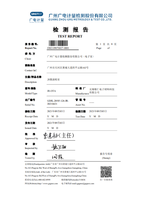 依據(jù)場(chǎng)強(qiáng)探頭校準(zhǔn)規(guī)范IEEE Std 1309-2013中規(guī)定的在微波暗室中的校準(zhǔn)方法所設(shè)計(jì)的全電波暗室,且本實(shí)驗(yàn)室滿足JJF 1886-2020場(chǎng)強(qiáng)探頭校準(zhǔn)規(guī)范的場(chǎng)地要求,1GHz-40GHz全頻段內(nèi)場(chǎng)地電壓駐波比小于1db.暗示屏蔽效能滿足GBT 12190要求。